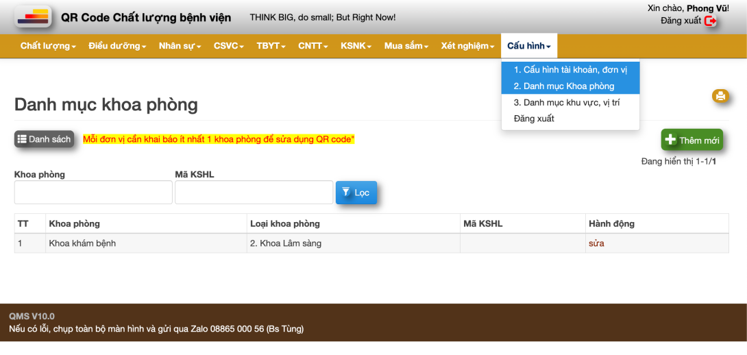 - Thêm khoa phòng mới, click vào "+ Thêm mới".