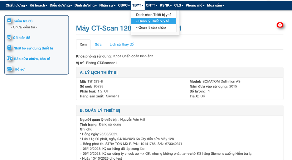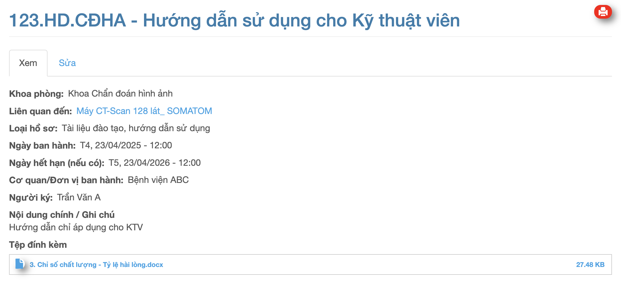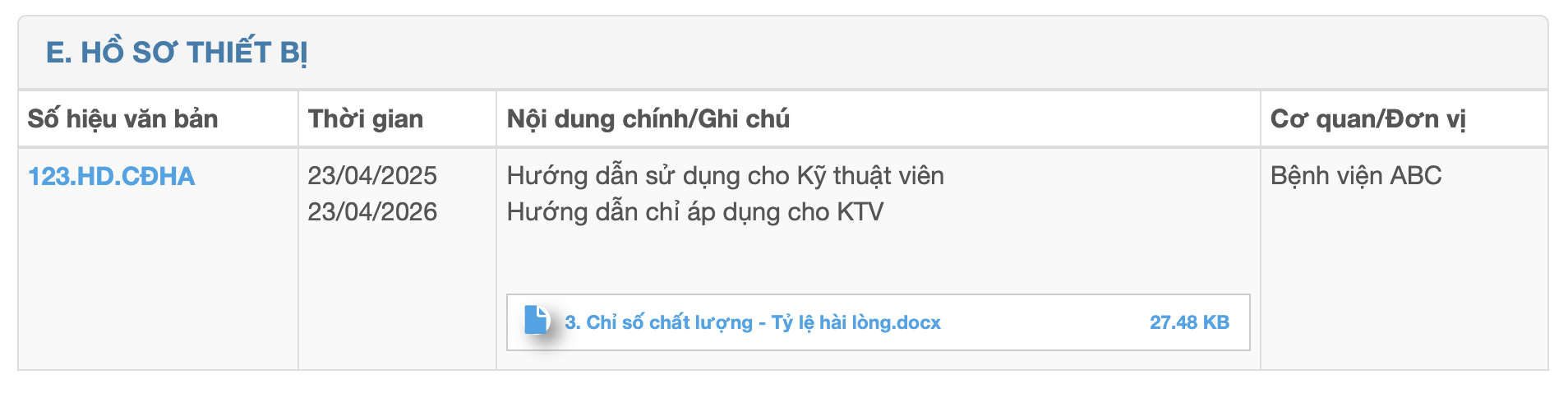 - Tại trang thông tin, quản lý thiết bị cụ thể. Ở phần "E. HỒ SƠ THIẾT BỊ" là danh sách các hồ sơ tài liệu liên quan.