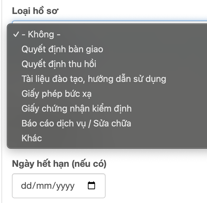 - Sau khi click vào sẽ vào form để nhập hồ sơ mới liên quan đến thiết bị hiện tại.