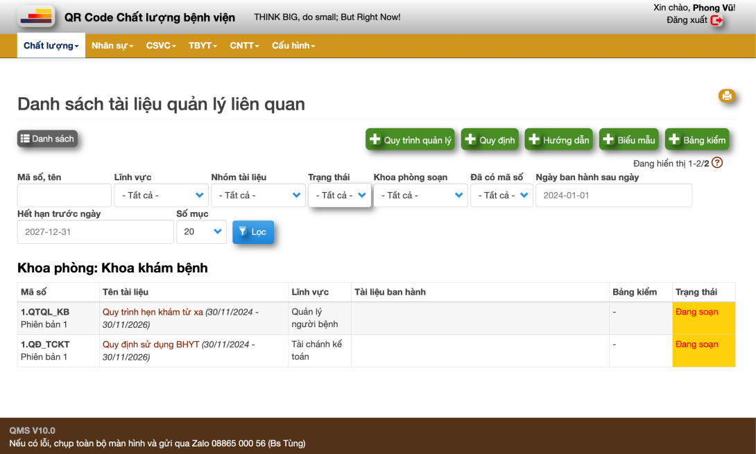 Để thuận lời cho việc soạn thảo. Hiện tại trong phân hệ phòng QLCL, phần mềm chỉ cho phép tạo các tài liệu mà phòng QLCL làm đầu mối. Các loại tài liệu khác để trong phân hệ của các khoa phòng tương ứng. Tuy nhiên trong phân hệ QLCL vẫn có thể tiếp cận, quản lý tất cả tài liệu.