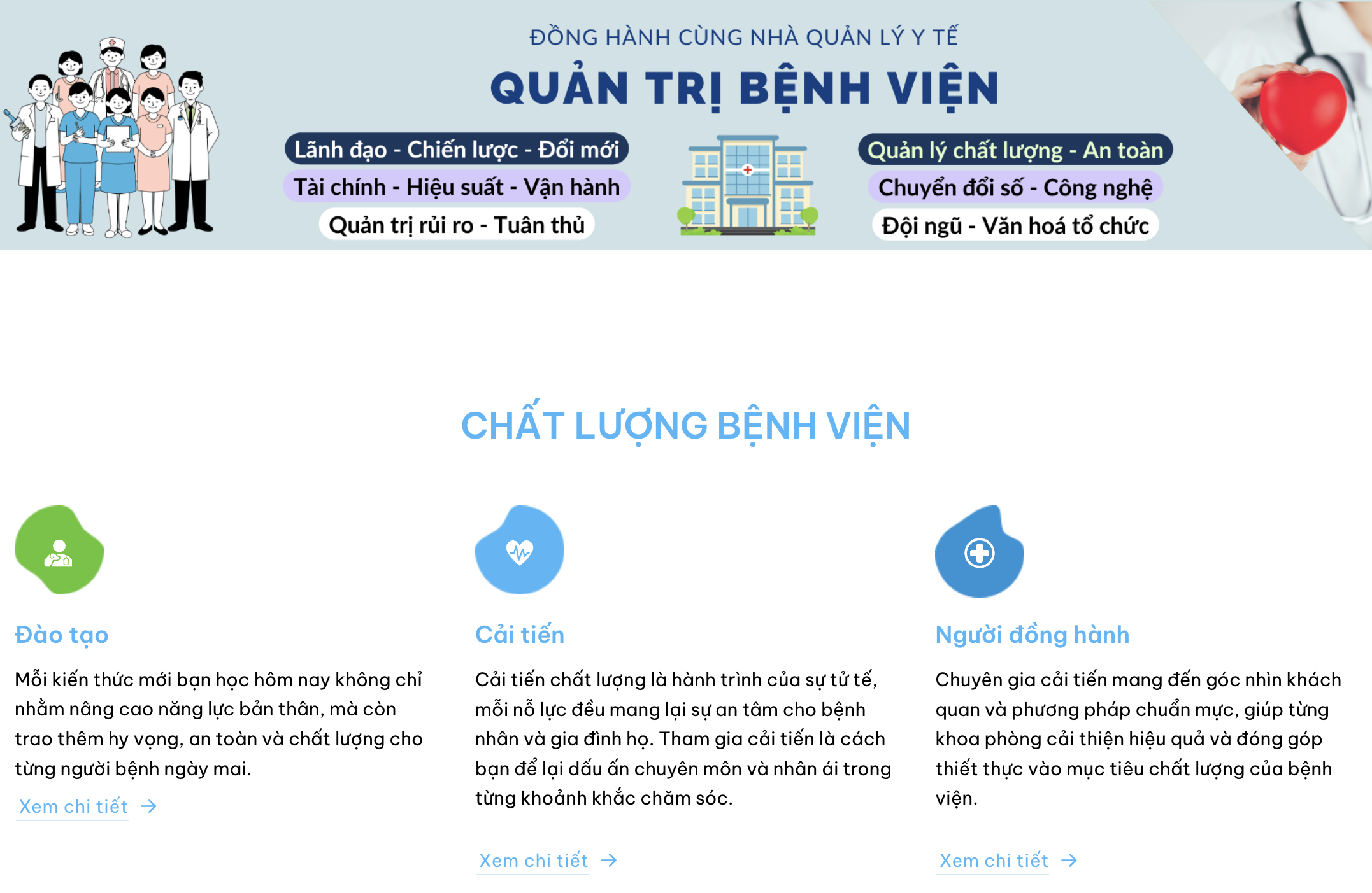 Hỗ trợ bệnh viện triển khai đồng bộ các hoạt động chất lượng, an toàn người bệnh theo Bộ tiêu chí CLBV 6858/QĐ-BYT, ISO 9001, JCI, Lean, 5S và các mô hình cải tiến hiện đại.