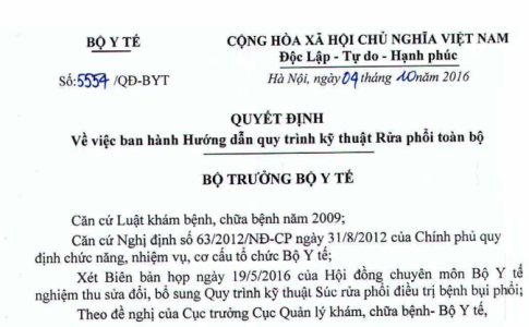 Quyết định 5554/QĐ-BYT năm 2016 Hướng dẫn Quy trình kỹ thuật Rửa phổi toàn bộ do Bộ trưởng Bộ Y tế ban hành