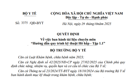 Quyết định 3375/QĐ-BYT năm 2025 về Tài liệu chuyên môn “Hướng dẫn quy trình kỹ thuật Hô hấp - Tập 1.1” do Bộ trưởng Bộ Y tế ban hành