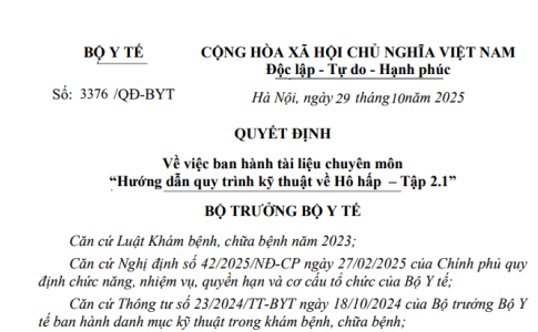 Quyết định 3376/QĐ-BYT năm 2025 về Tài liệu chuyên môn “Hướng dẫn quy trình kỹ thuật về Hô hấp - Tập 2.1” do Bộ trưởng Bộ Y tế ban hành