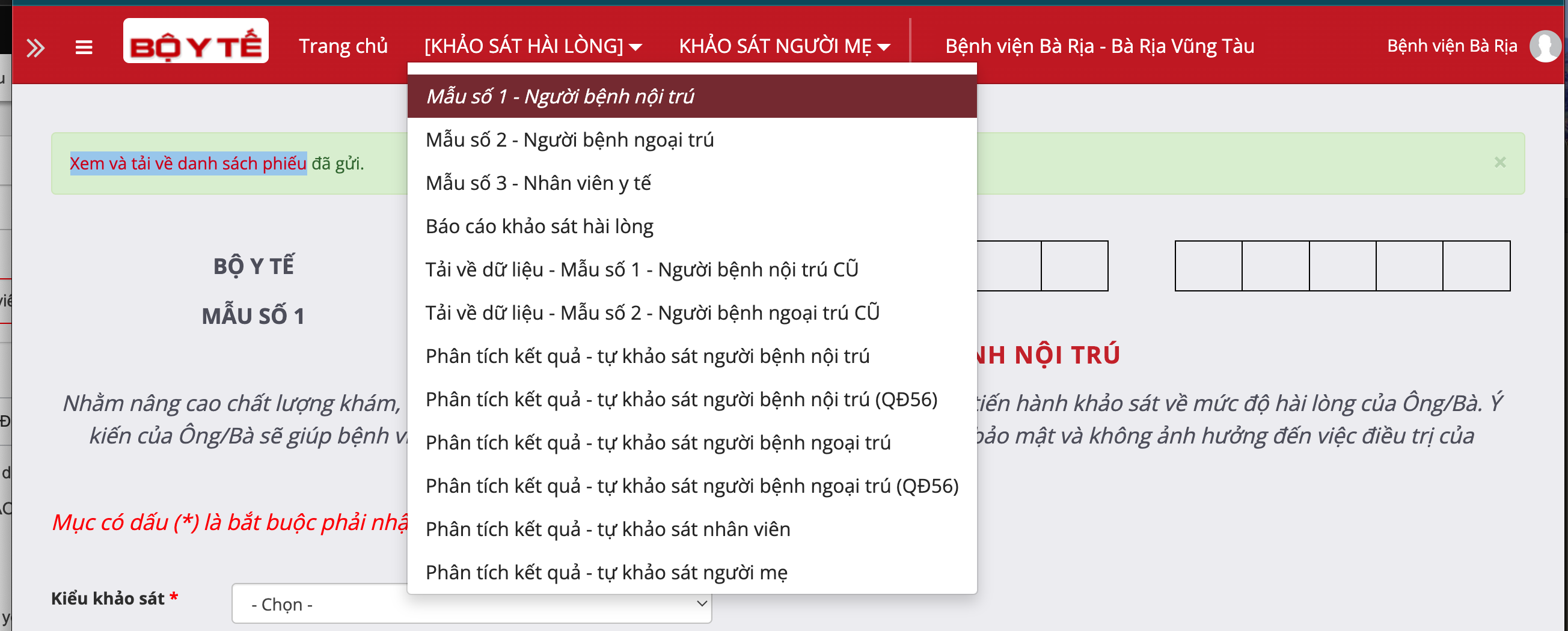 - Tại phiếu khảo sát hài lòng vừa truy cập, nếu trong năm hiện tại đơn vị đã nhập phiếu khảo sát, sẽ có dòng chữ đò trên nền xanh như hình trên "Xem và tải về danh sách phiếu đã gửi."