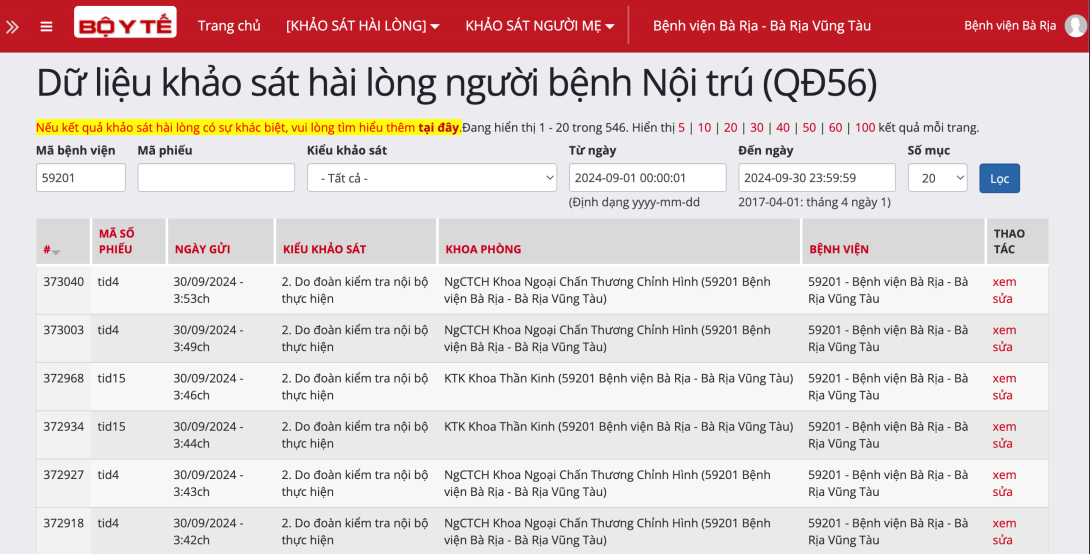 - Click vào link để vào trang "Dữ liệu khảo sát hài lòng ..."