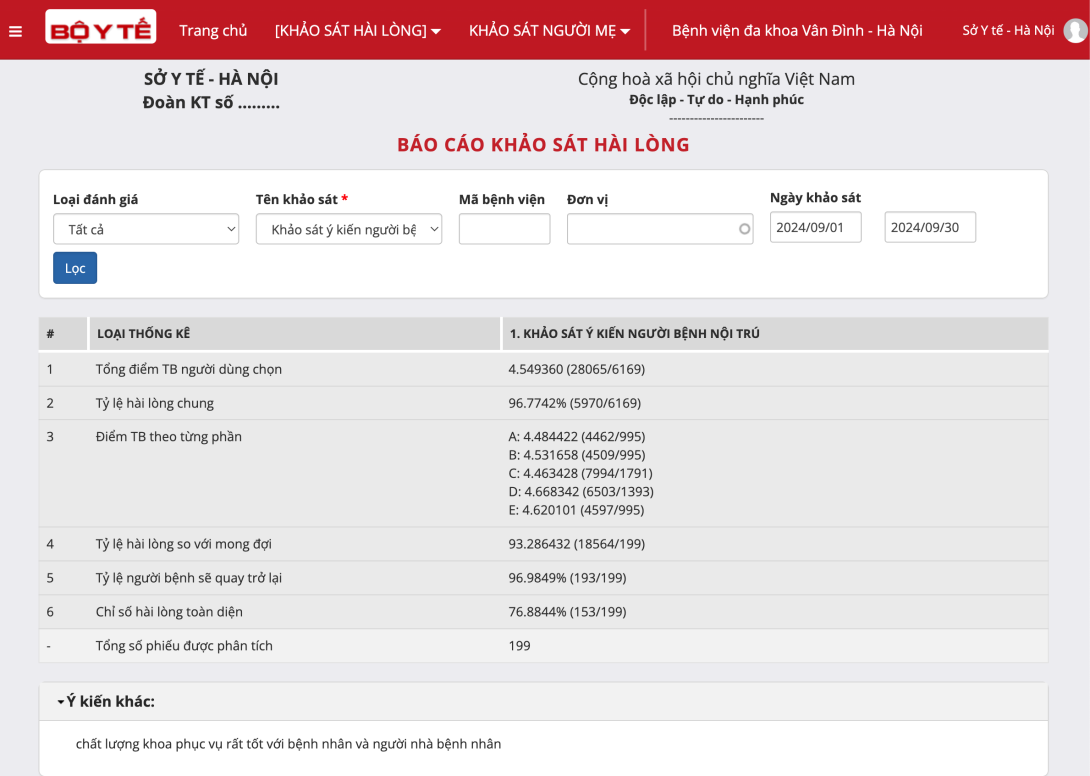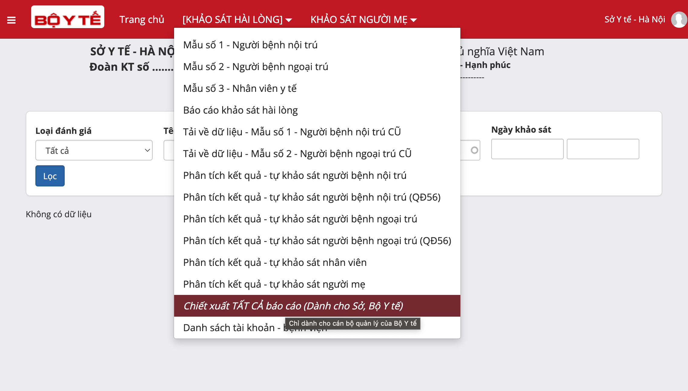 - Click [KHẢO SÁT HÀI LÒNG] ==> "Chiết xuất TẤT CẢ báo cáo (Dành cho Sở, Bộ Y tế)"