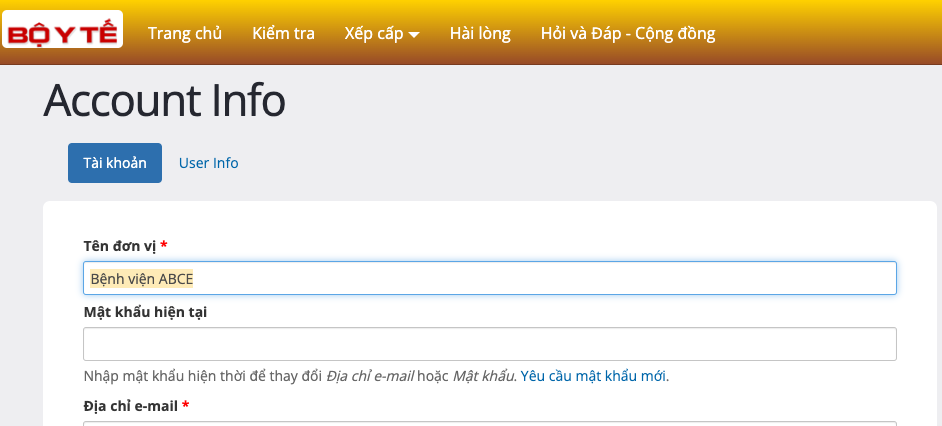 Email và Số điện thoại: khuyến cáo dùng email của (TRƯỞNG) phòng Quản lý chất lượng hoặc Tổ trưởng tổ Quản lý chất lượng hoặc Kế hoạch tổng hợp. Đối với Sở Y tế thì là email của (người phụ trách) phòng Nghiệp vụ Y. Việc này giúp đơn vị thay đổi mật khẩu hoặc đặt lại mật khẩu khi quên mật khẩu/tài khoản.