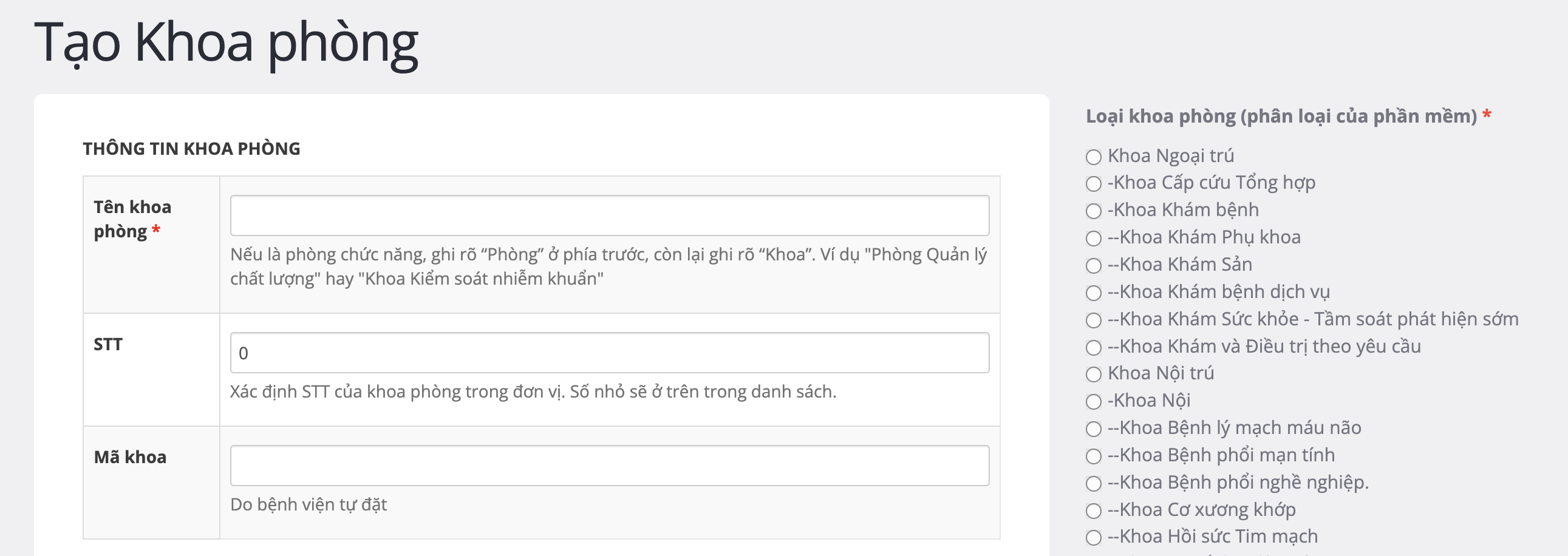 Nhập thông tin khoa phòng phù hợp.