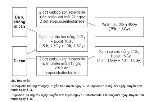 Tia xạ: 36Gy sọ não tủy sống boost 54Gy diện u (tumor bed), 45Gy tại những vị trí tổn thương tủy sống mà không cần xem xét mức độ đáp ứng với hóa chất tấn công.
