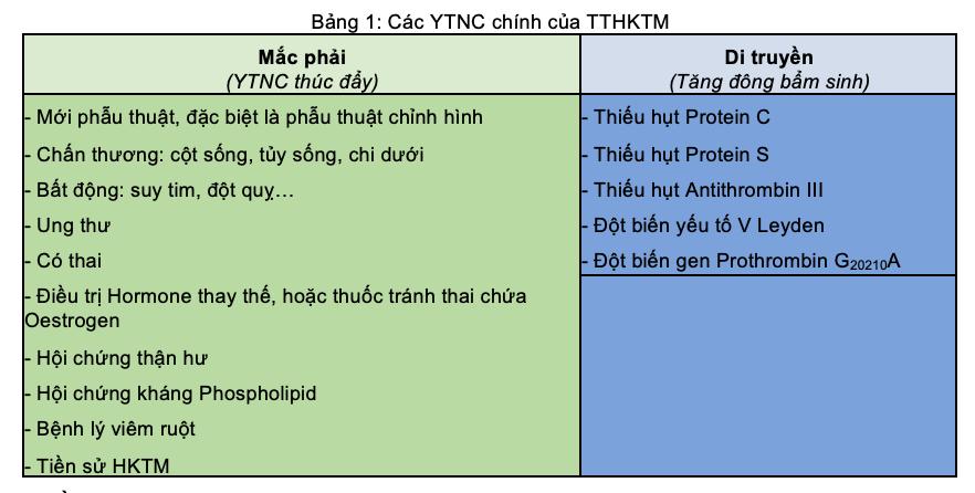 Nguyên nhân gây ra TTHKTM thường được chia làm hai nhóm: di truyền và mắc phải (Bảng 1). Tuy nhiên, TTHKTM có thể là hậu quả của nhiều yếu tố, gọi là các yếu tố thúc đẩy, góp phần làm tăng nguy cơ hình thành cục máu đông dẫn đến TTHKTM. Nguy cơ tái phát TTHKTM phụ thuộc một phần vào sự tham gia của các yếu tố thúc đẩy tại thời điểm bị TTHKTM lần đầu. Các yếu tố thúc đẩy tạm thời là những yếu tố sớm được giải quyết sau khi gây ra tình trạng huyết khối, như mới phẫu thuật, mổ lấy thai, bệnh cấp tính phải nằm tại giường bệnh trên 3 ngày…Yếu tố thúc đẩy dai dẳng là những YTNC tồn tại kéo dài, như ung thư tiến triển, tái phát, hoặc đang trong liệu trình điều trị. Cũng có thể là bệnh lý không ung thư, nhưng làm tăng nguy cơ tái phát TTHKTM ít nhất 2 lần sau khi dừng điều trị kháng đông như viêm ruột. TTHKTM không rõ yếu tố thúc đẩy nếu không xác định được rõ ràng các YTNC nói trên.