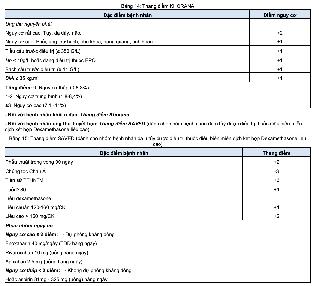 + Trong một số trường hợp bệnh nhân đa u tủy được điều trị thuốc điều biến miễn dịch kết hợp dexamethasone, có thể sử dụng thuốc aspirin như liệu pháp dự phòng huyết khối nếu nguy cơ theo thang điểm SAVED thấp < 2 điểm.
