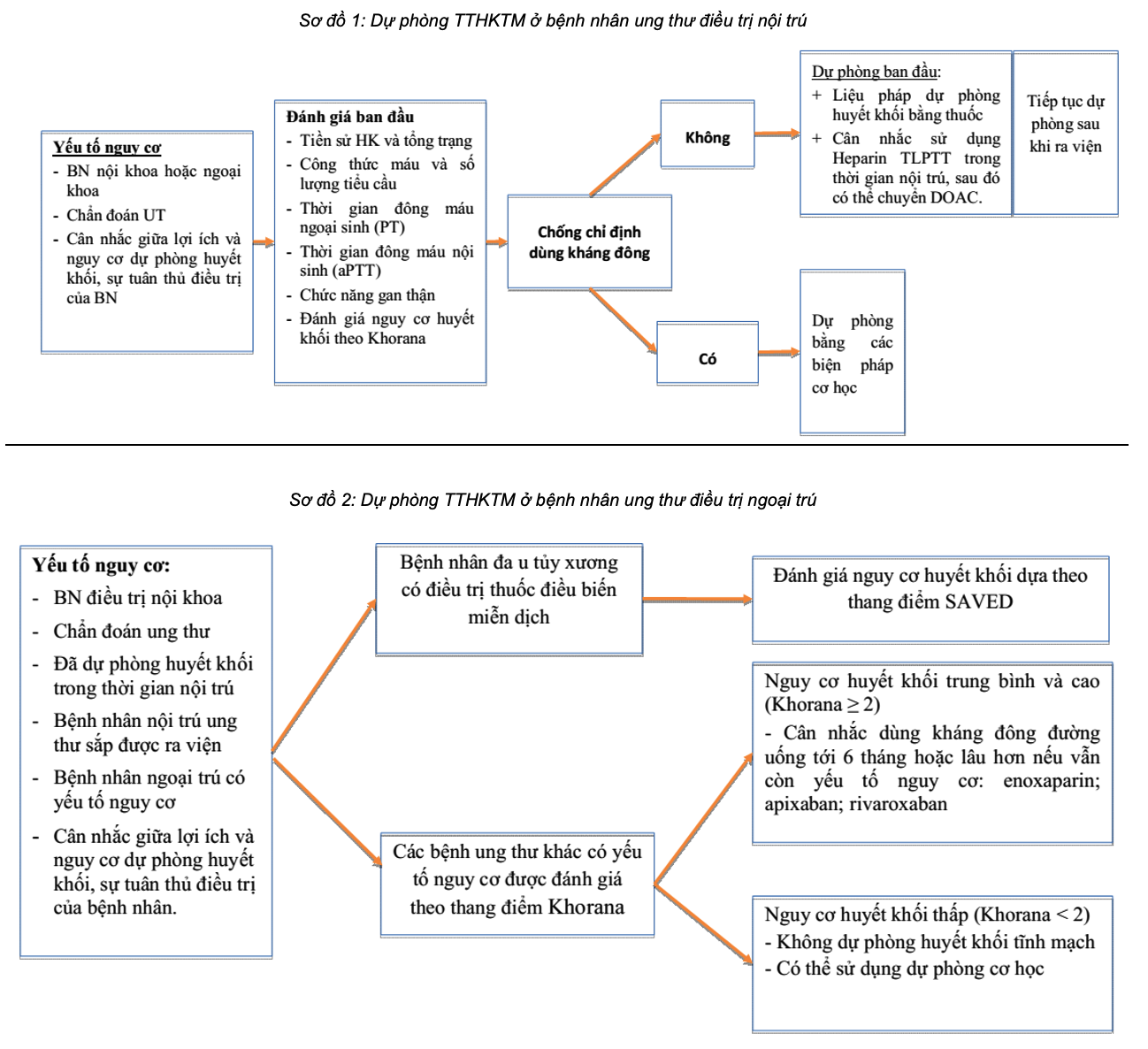 + Nhóm nguy cơ thấp, Khorana < 2 điểm: Không chỉ định dự phòng huyết khối tiên phát, tuy nhiên có thể dự phòng bước 2 với nhóm bệnh nhân nguy cơ cao như tiền sử huyết khối nhưng không được điều trị liên tục.