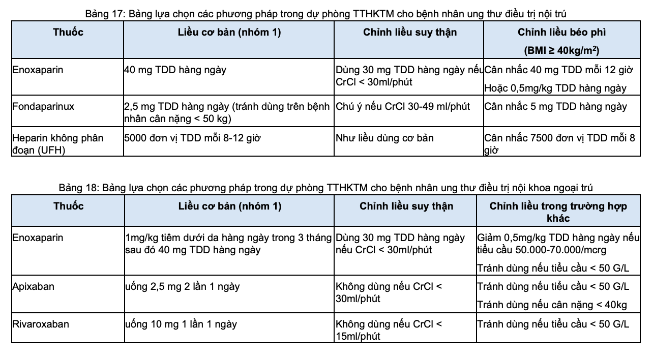 - Dự phòng bằng thuốc: Bệnh nhân ung thư điều trị nội trú có/không kèm theo giảm vận động, nên dự phòng huyết khối bằng thuốc nếu không có nguy cơ biến chứng (ví dụ: bn mới phẫu thuật, xuất huyết đại thể, giảm tiểu cầu <50,000/microL).