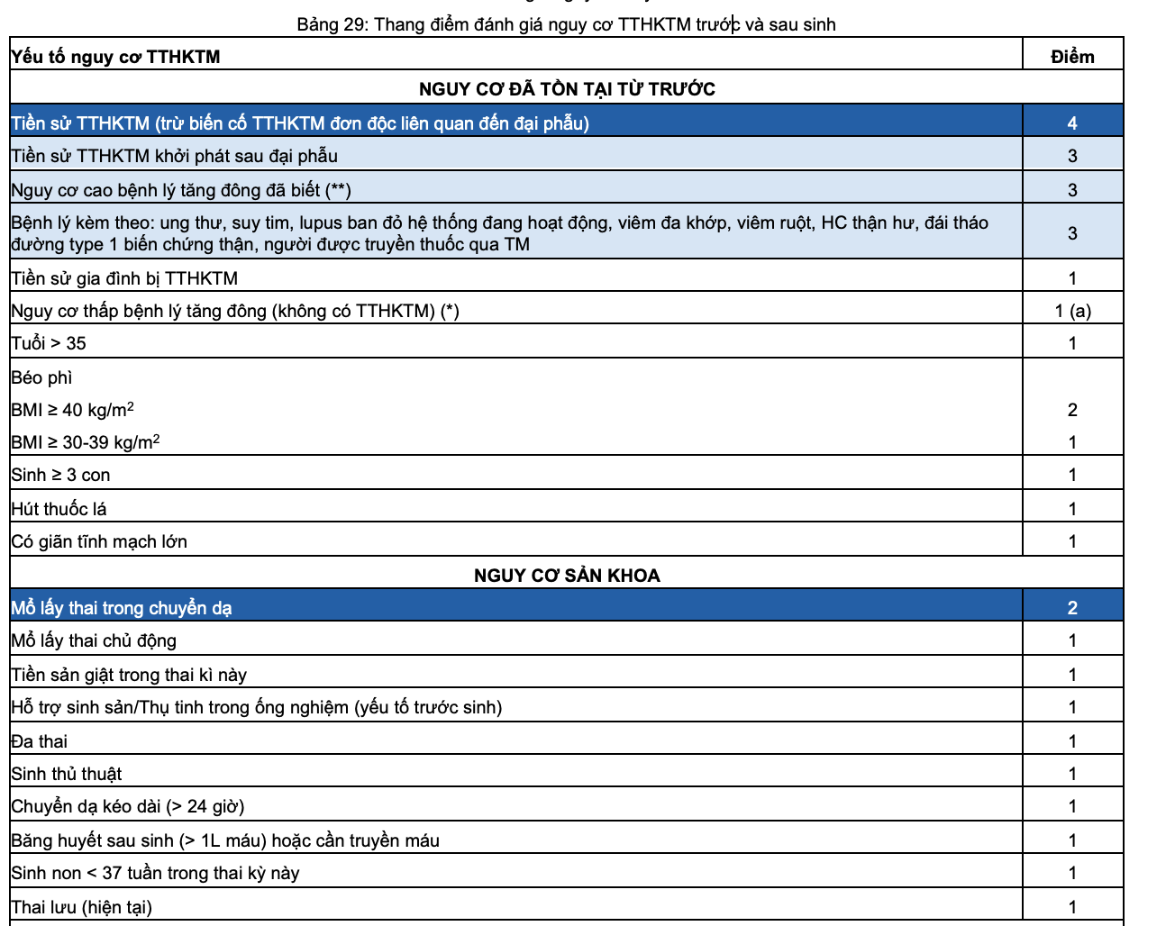 - Các YTNC khác: bệnh tim, bệnh lý hemoglobin, tăng huyết áp, tiền sản giật, hội chứng thận hư, lupus ban đỏ hệ thống, mổ lấy thai, băng huyết sau sinh, nghén nặng, truyền máu, thai lưu, nhiễm trùng hậu sản, hỗ trợ sinh sản, đa thai, sinh non, tuổi >35, béo phì (BMI >30 kg/m2), hút thuốc lá (> 10 điếu/ngày), bất động thời gian đài...