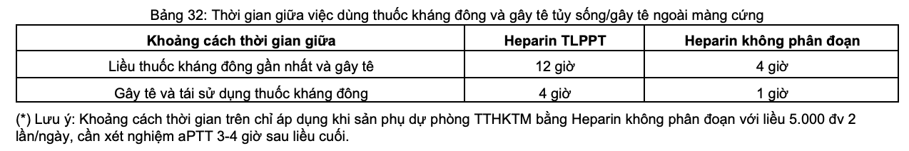 - Cần theo dõi biến chứng máu tụ trong vòng 24 giờ sau tủy sống/tê ngoài màng cứng hoặc sau khi rút catheter ngoài màng cứng.