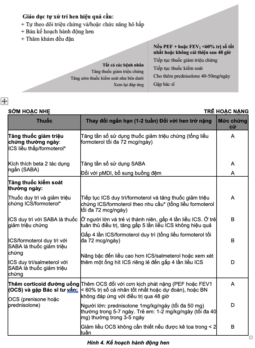 Tất cả các BN HPQ đều cần có kế hoạch hành động hen phù hợp với mức độ nặng và tình trạng sức khỏe chung để BN có thể tự phát hiện, xử trí khi xuất hiện tình trạng bệnh nặng hơn. * ICS/formoterol: duy trì và giảm triệu chứng: budesonide liều thấp hoặc beclometasone với formoterol.
