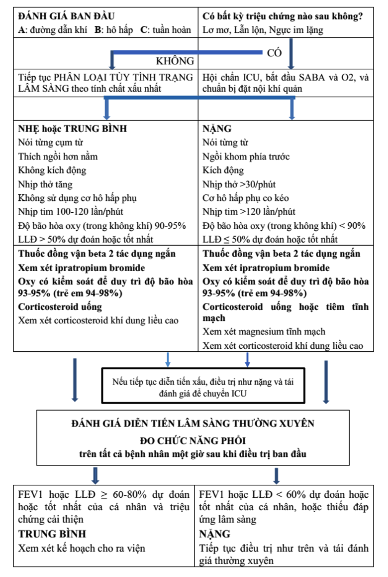 ICS: corticosteroid dạng khí dung, dạng hít xịt; ICU: khoa săn sóc đặc biệt; IV: tiêm tĩnh mạch; O2: oxy; LLĐ: lưu lượng thở ra đỉnh; FEV1: thể tích thở ra gắng sức 1 giây đầu