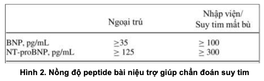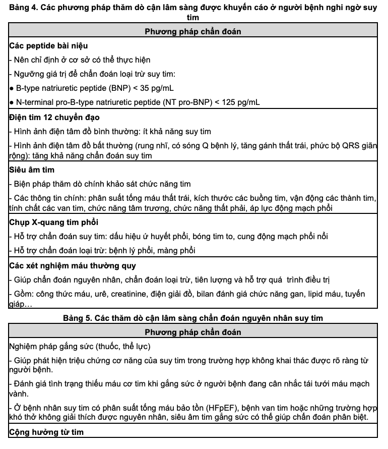 Các phương pháp chẩn đoán cận lâm sàng thường quy như điện tâm đồ, siêu âm tim qua thành ngực, định lượng nồng độ peptide lợi niệu, X-quang tim phổi thẳng hay các xét nghiệm tế bào hoặc sinh hóa máu thường quy có ý nghĩa trong chẩn đoán suy tim. Vai trò của từng phương pháp được thể hiện trong bảng 4 và bảng 5.