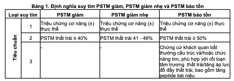 Phân loại suy tim dựa trên phân suất tống máu thất trái (bảng 1)