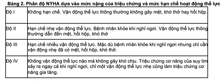 Theo Hội Tim mạch New York, còn gọi là phân độ NYHA, được áp dụng trong giai đoạn suy tim C và D (bảng 2).