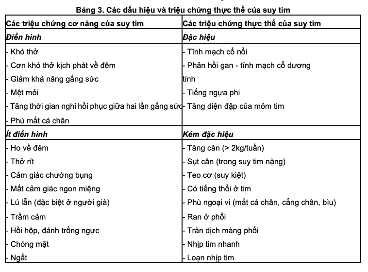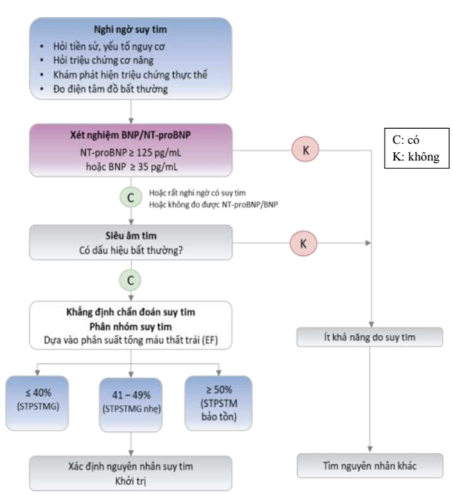 Chẩn đoán suy tim dựa trên sự kết hợp các triệu chứng cơ năng, thực thể và các xét nghiệm, thăm dò cận lâm sàng. Người bệnh được chẩn đoán suy tim khi có triệu chứng cơ năng của suy tim và/hoặc triệu chứng thực thể của suy tim kèm theo bằng chứng khách quan của rối loạn chức năng tim. Phác đồ chẩn đoán suy tim được thể hiện ở hình 3 dưới đây.