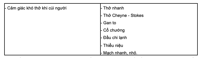 - Các triệu chứng sung huyết: khó thở khi nằm, phù phổi, phù ngoại biên, tĩnh mạch cổ nổi, gan to, cổ trướng và phản hồi gan - tĩnh mạch cổ dương tính.