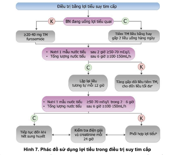 - Liều khởi đầu furosemid tĩnh mạch nên tương đương 1 - 2 lần liều uống hàng ngày trước khi nhập viện đối với người đang dùng lợi tiểu đường uống. Nếu người bệnh chưa dùng furosemid thì nên khởi đầu bằng liều 20 - 40 mg tiêm tĩnh mạch. Cần đánh giá natri niệu sau 2 giờ hoặc tổng lượng nước tiểu sau 6 giờ để điều chỉnh liều lượng thuốc lợi tiểu quai cho phù hợp (xem hình 7). Tránh dùng lợi tiểu quai liều quá cao vì có thể dẫn đến tổn thương thận cấp và kháng lợi tiểu.