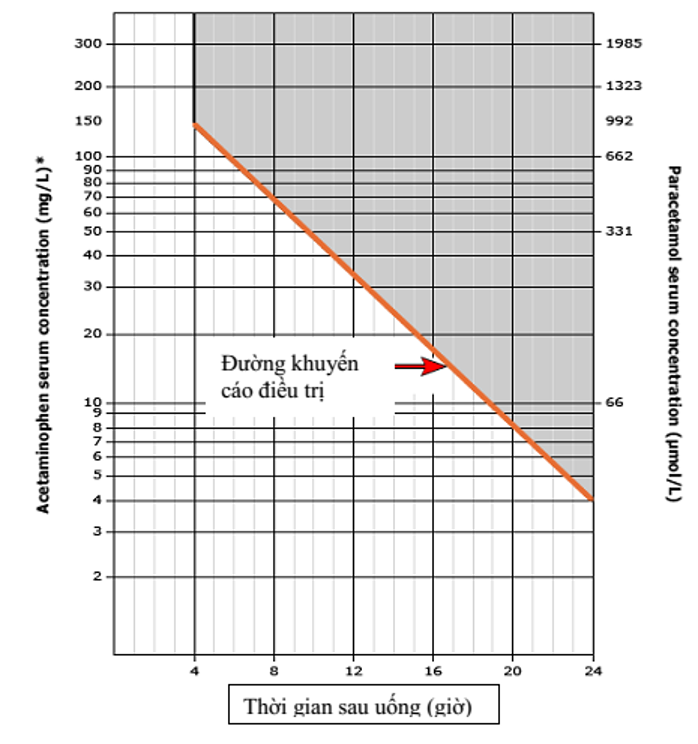 - Trường họp ngộ độc acetaminophen cấp, đối chiếu nồng độ acetaminophen máu tại thời điểm ≥ 4 giờ lên đồ thị Rumack matthew ở ngưỡng điều trị