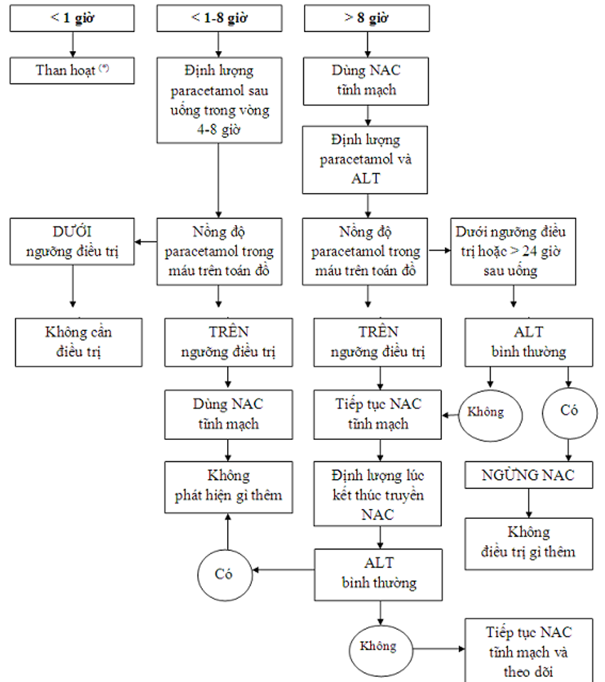 - Nếu nồng độ paracetamol dưới ngưỡng điều trị và ALT bình thường thì ngừng NAC. Nếu nồng độ paracetamol trên ngưỡng điều trị hoặc ALT tăng thì tiếp tục dùng NAC