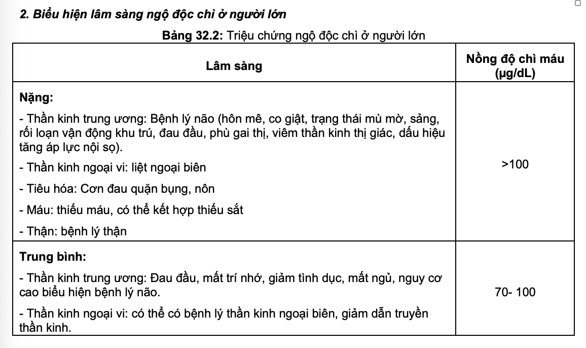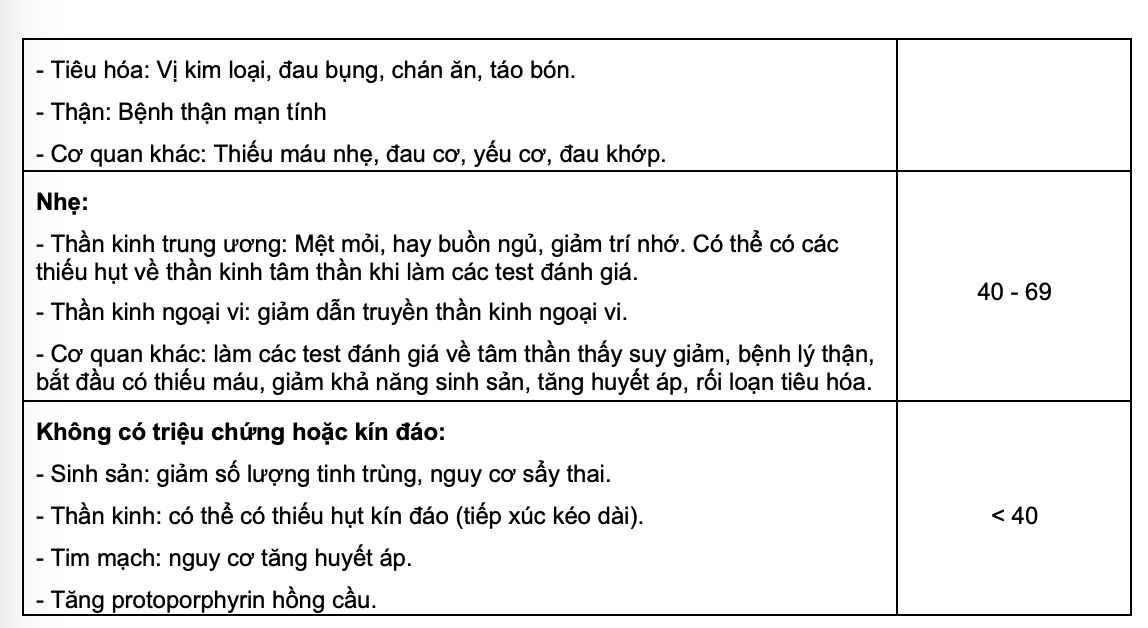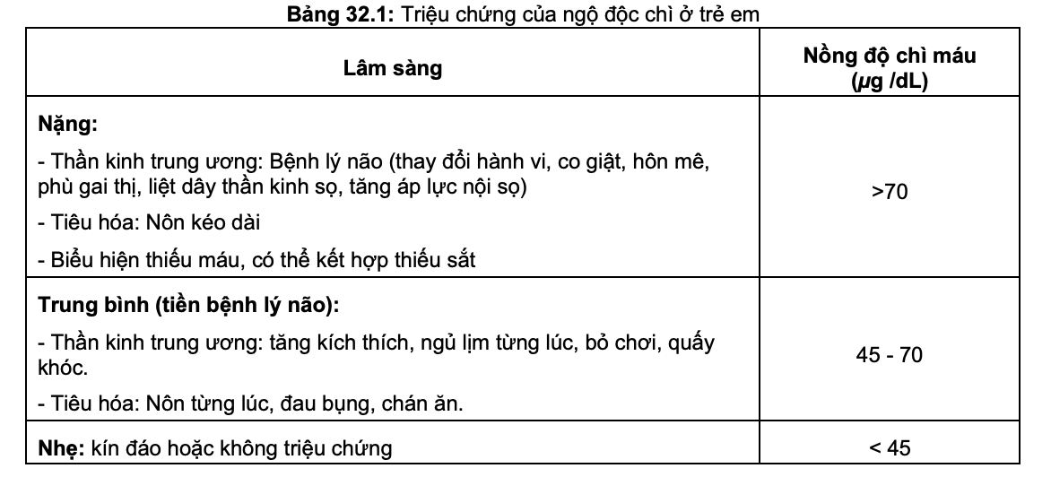 - Nồng độ chì > 70 µg/dL thường gây hội chứng não cấp ở trẻ nhỏ.