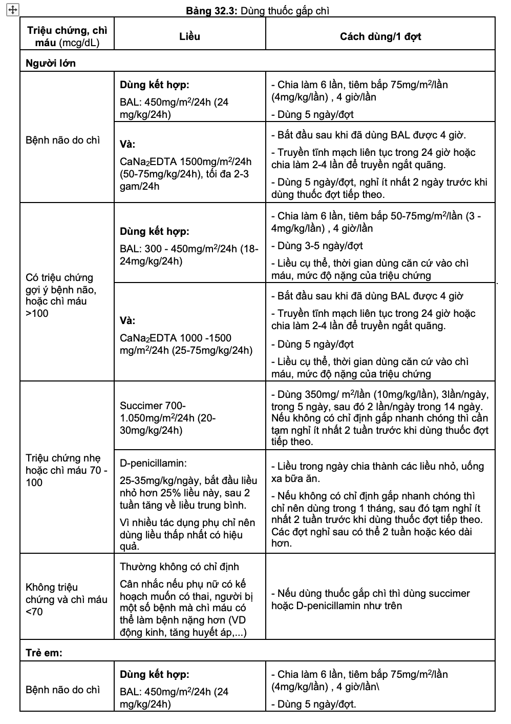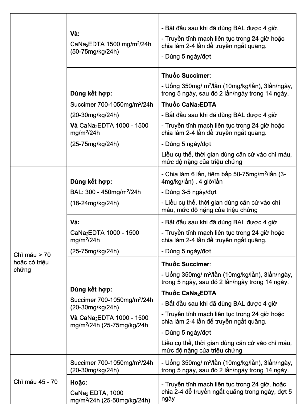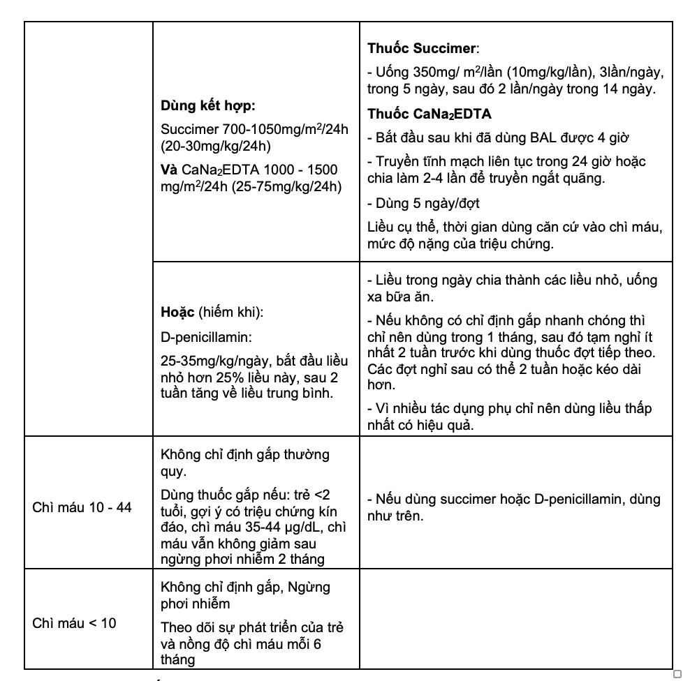 Chỉ định thuốc gắp chì dựa trên nồng độ chì máu, tuổi và triệu chứng của bệnh nhân.