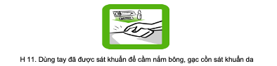 + Dùng tay (sau khi đã vệ sinh tay) để cầm bông cồn sát khuẩn. Khi sát khuẩn, không được chạm tay vào phần bông tiếp xúc với da vùng tiêm. (hình 11)