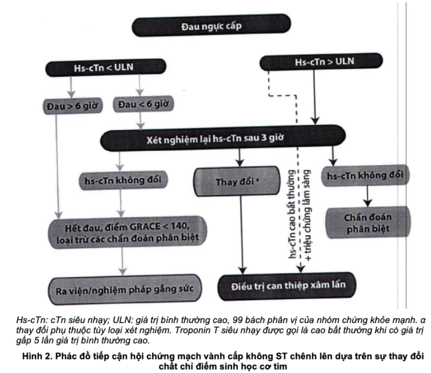 + Xét nghiệm các dấu ấn sinh học cơ tim: tốt nhất là Troponin T hoặc I siêu nhạy theo các phác đồ loại trừ 3 giờ và/hoặc 1 giờ.