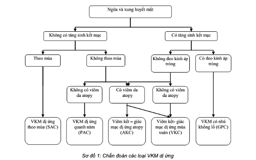 - Triệu chứng chẩn đoán: ngứa mắt, chảy nước mắt, xung huyết mắt, cảm giác có dị vật trong mắt, xung huyết kết mạc, phù kết mạc, và nang kết mạc.