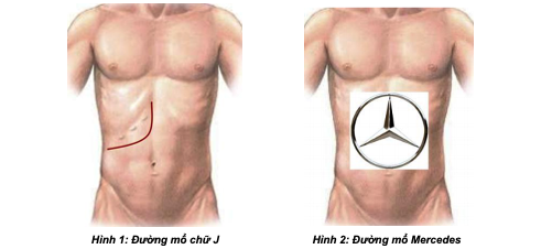 BƯỚC 1 - mở bụng: tùy theo thương tổn, chủ yếu mở đường dưới sườn mở rộng lên mũi ức hoặc đường chữ J.