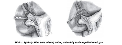 - Kiểm soát cuống phân thùy trước: có thể phẫu tích từng thành phần cuống phân thùy trước gồm đm phân thùy trước (tách ra từ đm gan phải) và tĩnh mạch cửa phân thùy trước; hoặc kiểm soát cả cuống phân thùy trước bằng cách tách nhẹ nhu mô gan khỏi cuống Glisson phân thùy trước (thường bằng kéo đầu tù) rồi luồn lắc qua cuống phân thùy trước.