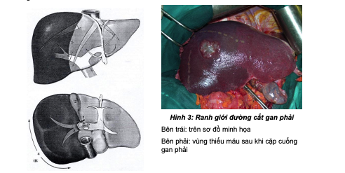 - Xác định diện cắt gan: cặp cuống phân thùy trước xác định đường thiếu máu bên phải (diện cắt gan sẽ nằm bên trái tĩnh mạch gan phải), diện cắt bên trái sẽ nằm dọc bờ phải của rãnh dây chằng tròn. Ở mặt dưới gan diện cắt sẽ đi theo đường thiếu máu giữa giường túi mật và đi ngang qua rốn gan và dọc bờ trên cuống gan trái.