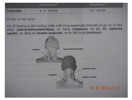 Vẹo cổ xoay | Cơ gối đâu (Splenius capitis) cùng bên | 350 |