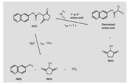 - Phản ứng tạo dẫn xuất hoàn toàn đòi hỏi một lượng dư số mol AQC. Lượng dư này sẽ bị thủy phân thành sản phẩm phụ là 6-aminoquinoline (AMQ), N-hydroxysuccinimide (NSH) và CO2, những sản phẩm phụ này không gây cản trở cho quá trình phân tích. Riêng AMQ sẽ tạo ra một peak có ý nghĩa và dễ dàng nhận biết được. Phản ứng thủy phân này xảy ra chậm hơn so với phản ứng tạo dẫn xuất.