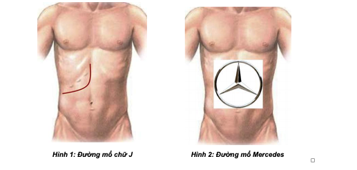 BƯỚC 1 - mở bụng: tùy theo thương tổn, chủ yếu mở đường dưới sườn mở rộng lên mũi ức hoặc đường chữ J đối với cắt gan lớn, còn cắt gan nhỏ có thể áp dụng đường mổ trắng giữa trên rốn.