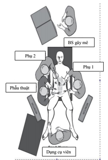 2 đứng bên phải người bệnh, màn hình đối diện với phẫu thuật viên. Dụng cụ viên đứng giữa 2 chân.