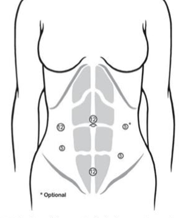 - Vị trí 6 trocart: Trocart 10 - 12mm giữa rốn cho camera, trocart 5mm đường giữa đòn phải mức mào chậu, trocart 5mm đường giữa đòn trái mức ngang rốn, trocart10 - 12mm dưới sườn phải, trocart 12mm trên xương mu, trocart 5mm hố chậu trái