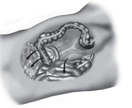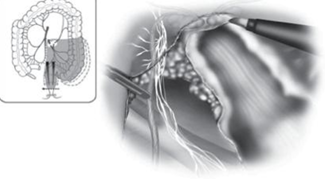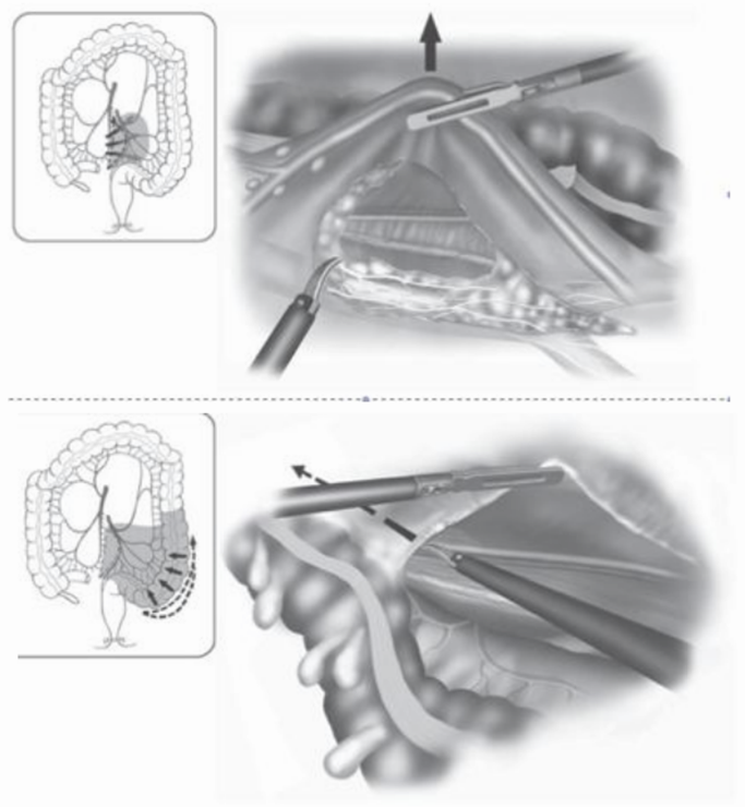 - Giải phóng đoạn đại tràng sigma trực tràng: cũng có thể áp dụng 2 phương pháp từ trong ra ngoài và từ ngoài vào trong. Mở phúc mạc phần thấp của mạc treo đại tràng sigma: bắt đầu ở u nhô, di dọc the bờ phải của động mạch chủ lên tới dây chằng treitz. Phẫu tích tổ chức mỡ xác định bó mạch mạc treo tràng dưới cặp clips cắt. Chú ý thần kinh giao cảm cạnh động mạch chủ.