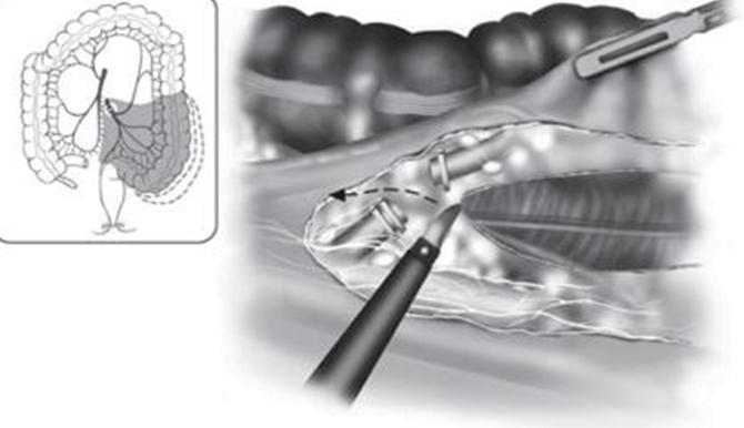 - Giải phóng đại tràng trái: phẫu tích mạc treo, tĩnh mạch mạc treo tràng dưới, mạch đại tràng sigma cũng như trực tràng trên, cắt mạc Told trái đi lên trên cắt dây chằng lách đại tràng đảm bảo đại tràng góc lách được Giải phóng hoàn toàn