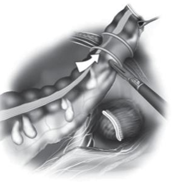 - Rạch da trên xương mu 5 cm, bảo vệ vết mổ thành bụng đưa đoạn đại tràng sigma ra ngoài thành bụng, cắt đoạn theo nguyên tắc ung thư, đặt đầu của máy nối tiêu hóa tròn vào lòng đại tràng, đóng kín lại bằng mũi khâu hình túi đưa trở lại ổ bụng, khâu lại vết mổ, bơm lại CO2.