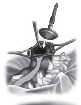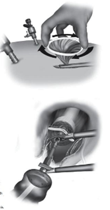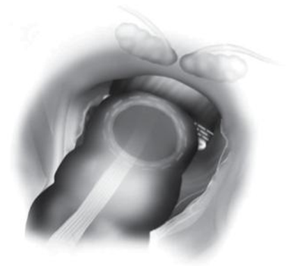 - Tiến hành nối mỏm trực tràng và đại tràng xuống bằng máy nối tròn đưa qua hậu môn. Kiểm tra miệng nối kín bằng cách bơm khí qua hậu môn sau khi đã cặp đầu trên đại tràng bằng grasper