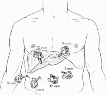- Vị trí trocart: trocart 12 mm đường giữa đòn phải dưới bờ sườn 7 cm, trocart 12mm đường giữa đòn trái dưới bờ sườn 2cm cho đầu dò siêu âm trong mổ. 2 Trocart 5mm dưới sườn trái và phải ngang mức rốn, 2 trocart 5mm đường nách trước phải và trái dưới bờ sườn