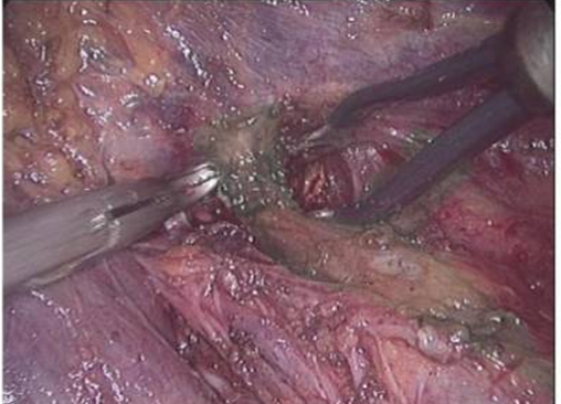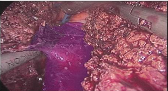 - Chuẩn bị cuống gan: một khi tổn thương gan có khả năng cắt nội soi, dây chằng tròn được kéo lên trước để bộc lộ cuống gan. Qua mạc nối nhỏ và khe winslow luồn lac để kiểm soát cuống gan khi chảy máu.