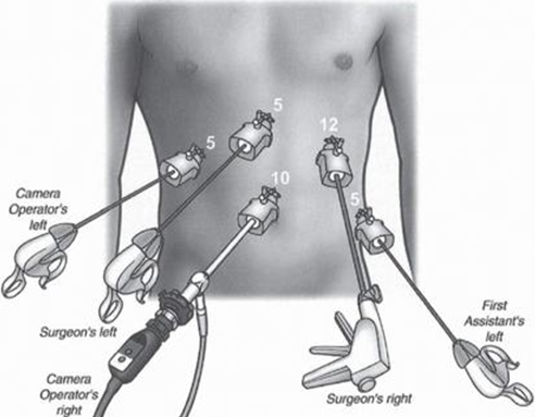 - Trocart 10mm ngang mức trên rốn cho Camera, trocart 5mm đường giữa đòn phải mức dưới sườn phải, trocart 12 đường giữa đòn trái mức dưới sườn trái cho phẫu thuật viên. Trocart 5mm đường nách trước ở mức dưới sườn phải và trocart 5mm đường nách trước mức dưới sườn trái